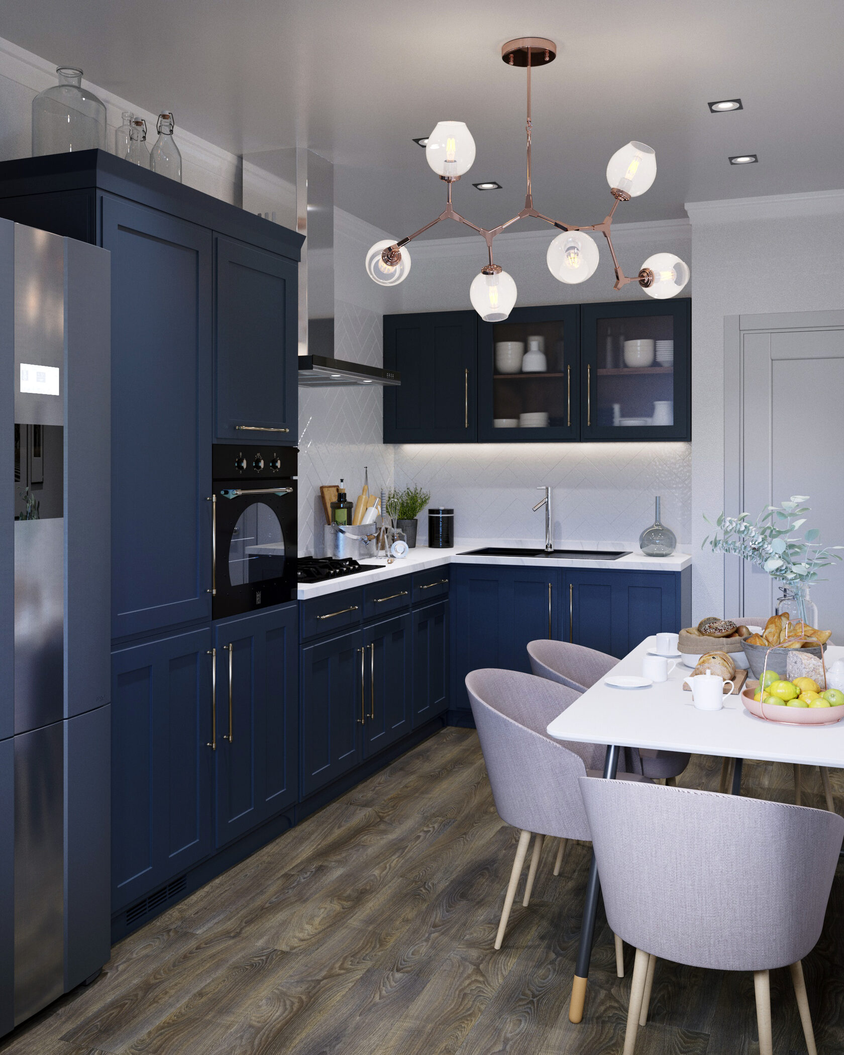 Лаконичный и свежий дизайн с натуральными материалами и акцентами цвета индиго.